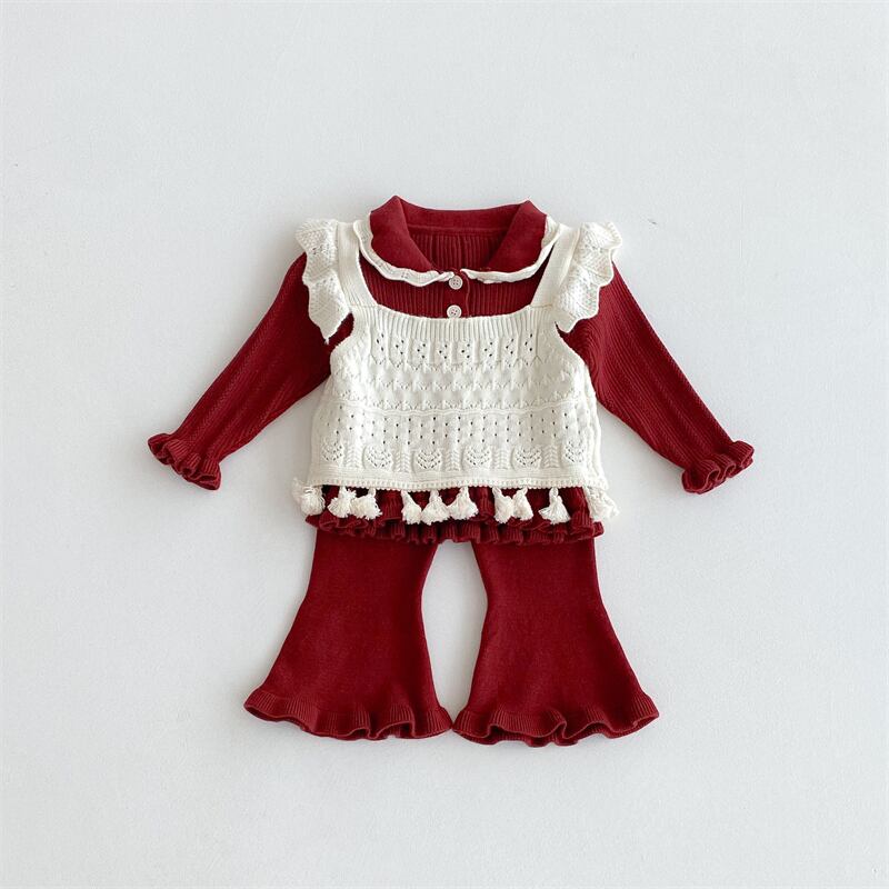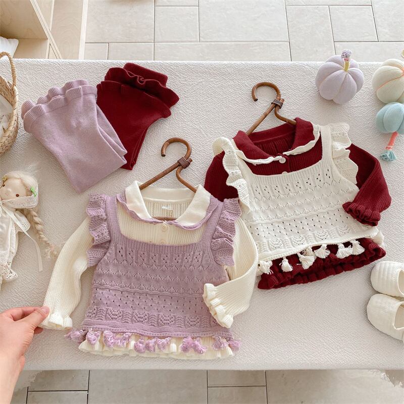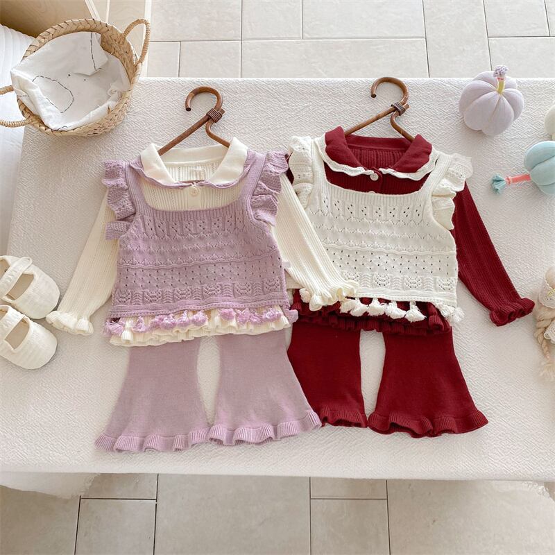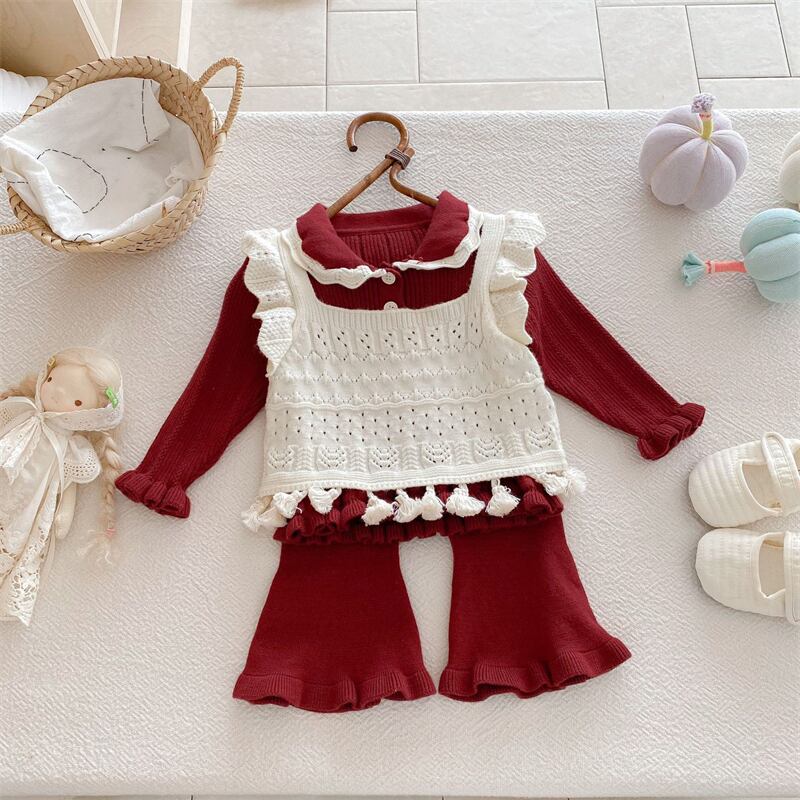 この3点セットは、子供たちの可愛さを引き立てるおしゃれなデザインで、ニットの柔らかい素材感が秋冬のお出かけを快適にサポートします。Tシャツ、ベスト、パンタロンの組み合わせで、シーンに合わせて自由にコーディネートを楽しんでいただけます。