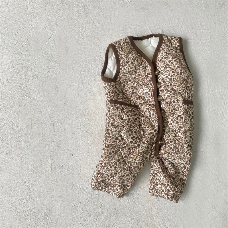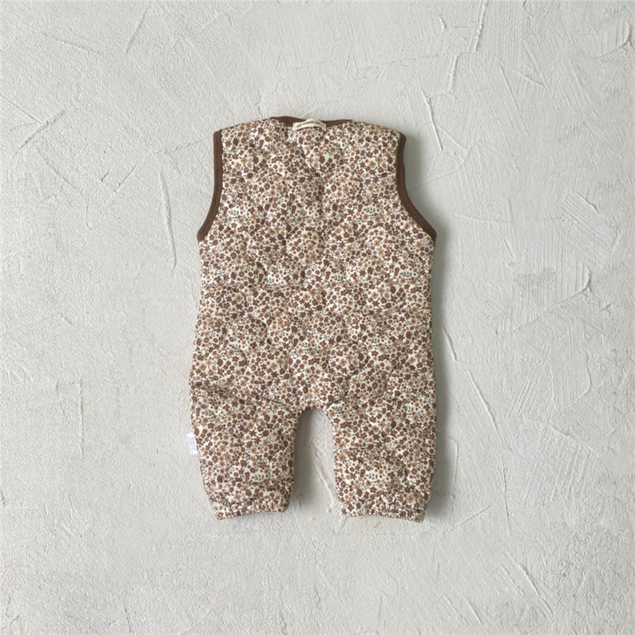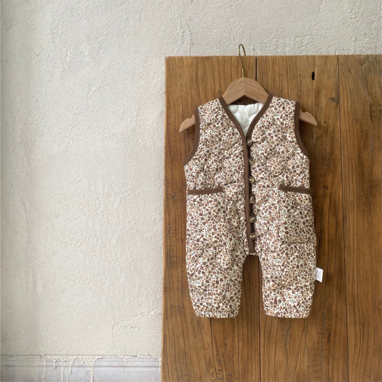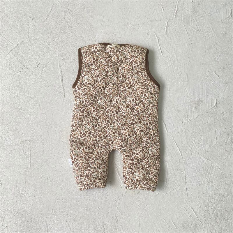 可愛いレトロな花柄が魅力のキルティングロンパース。秋冬の寒い季節でも、中綿が温かさをしっかりキープします。ノースリーブデザインで動きやすく、アクティブなお子さんにもピッタリ!どんなお洋服とも相性抜群なので、コーディネートの幅が広がります。
