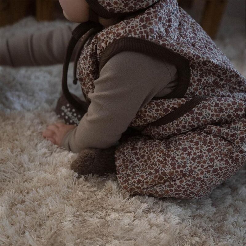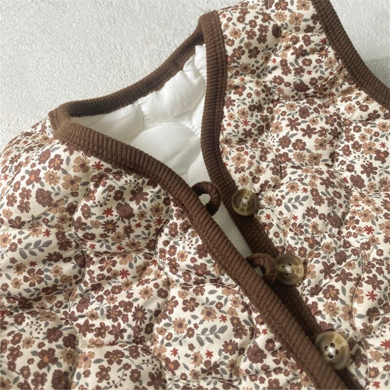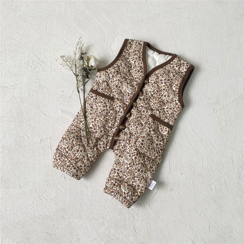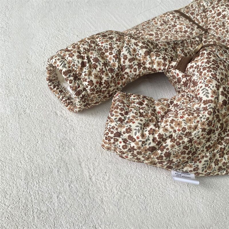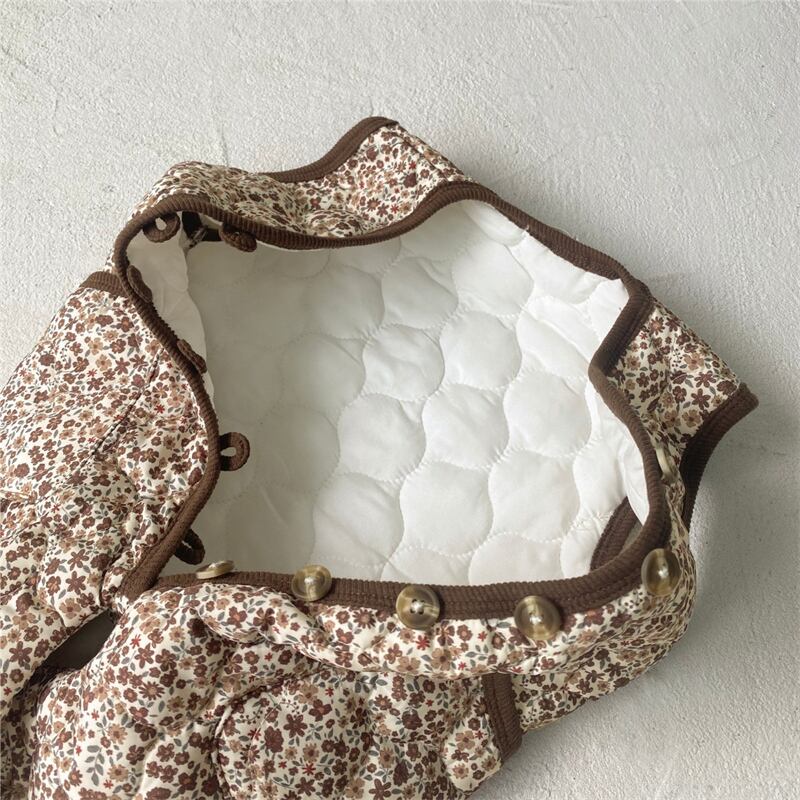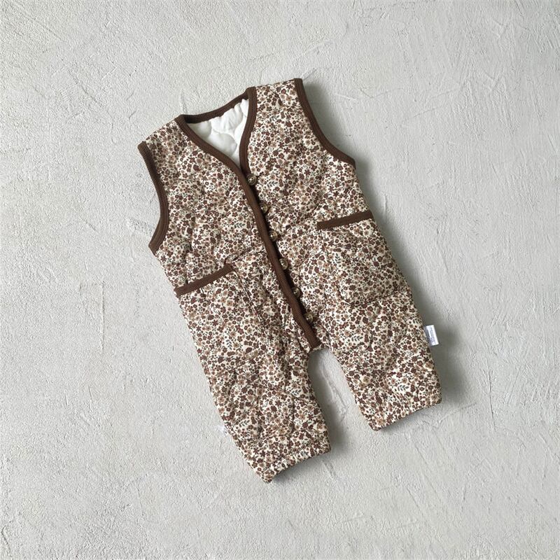 可愛いレトロな花柄が魅力のキルティングロンパース。秋冬の寒い季節でも、中綿が温かさをしっかりキープします。ノースリーブデザインで動きやすく、アクティブなお子さんにもピッタリ!どんなお洋服とも相性抜群なので、コーディネートの幅が広がります。