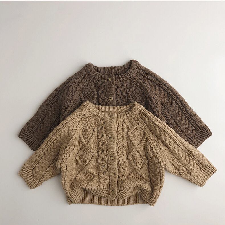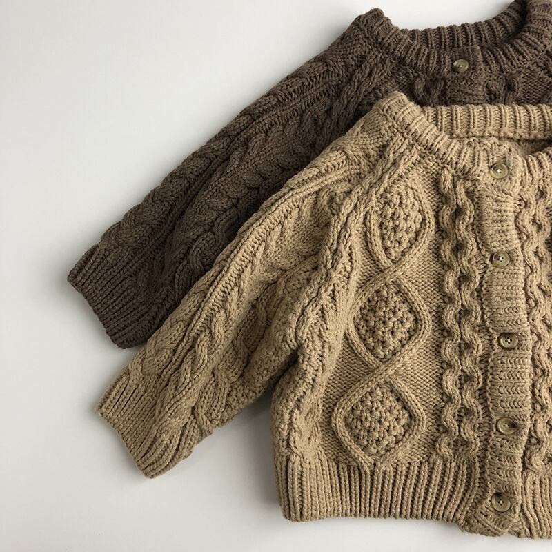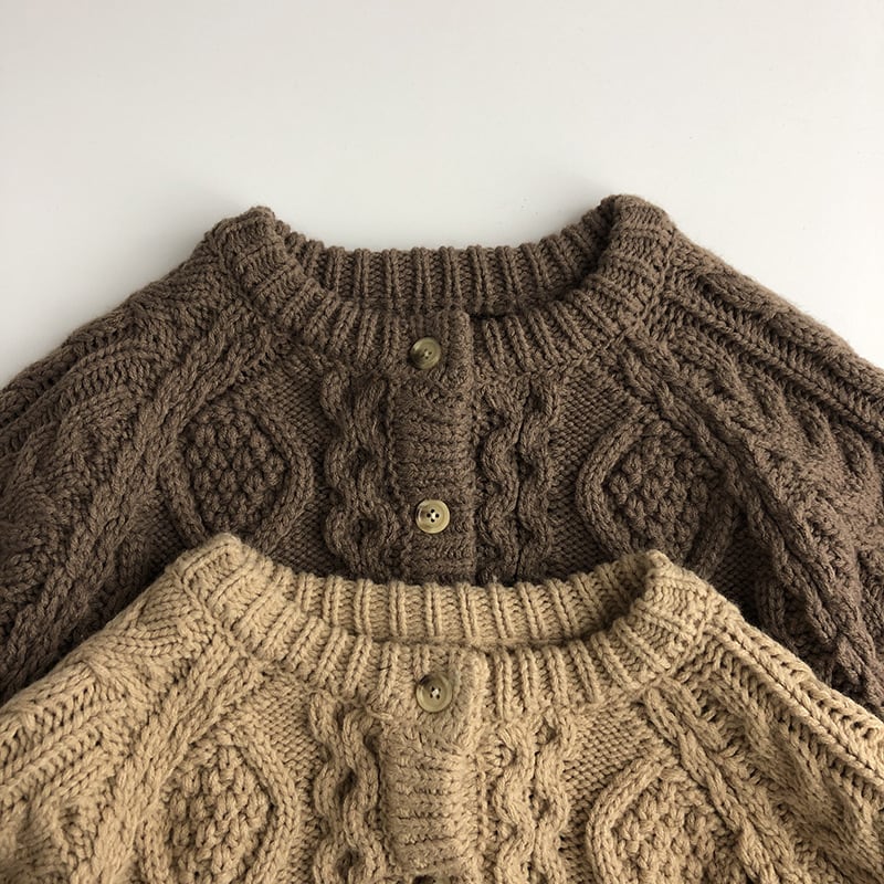 秋冬シーズンにぴったりの厚手カーディガン。アラン模様が特徴で、可愛いだけでなく温かさもバッチリ!ユニセックスデザインなので男の子にも女の子にもオススメです。多彩なシーンで活躍できる一着です。