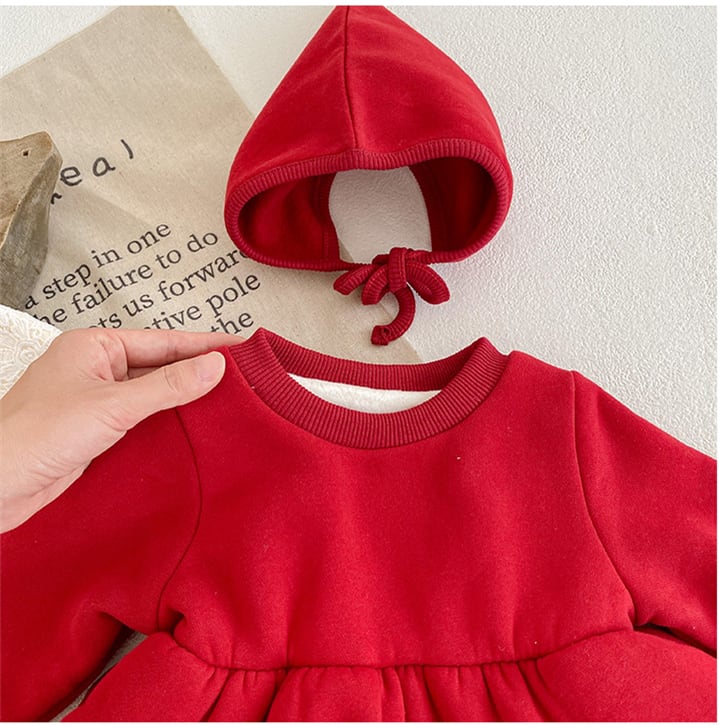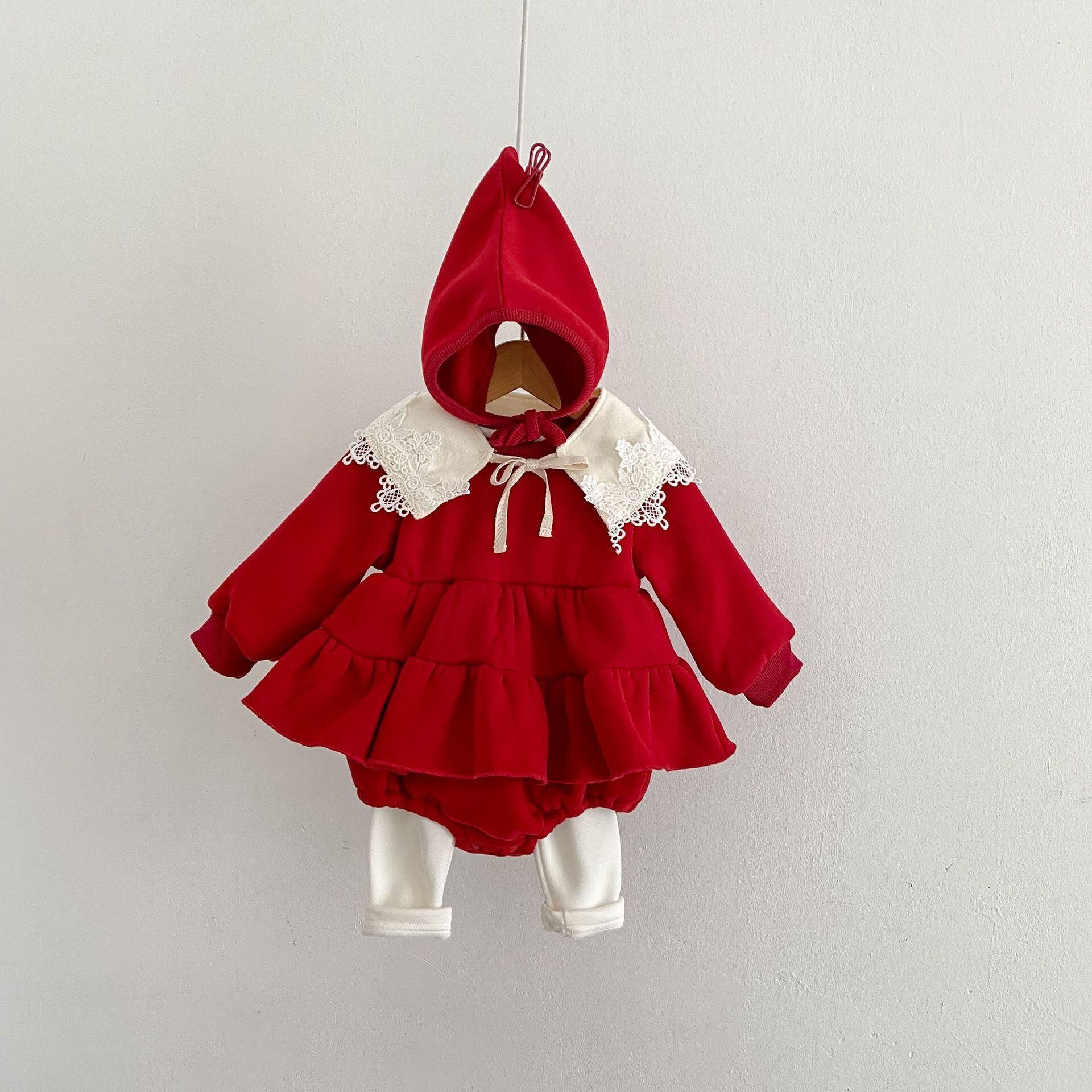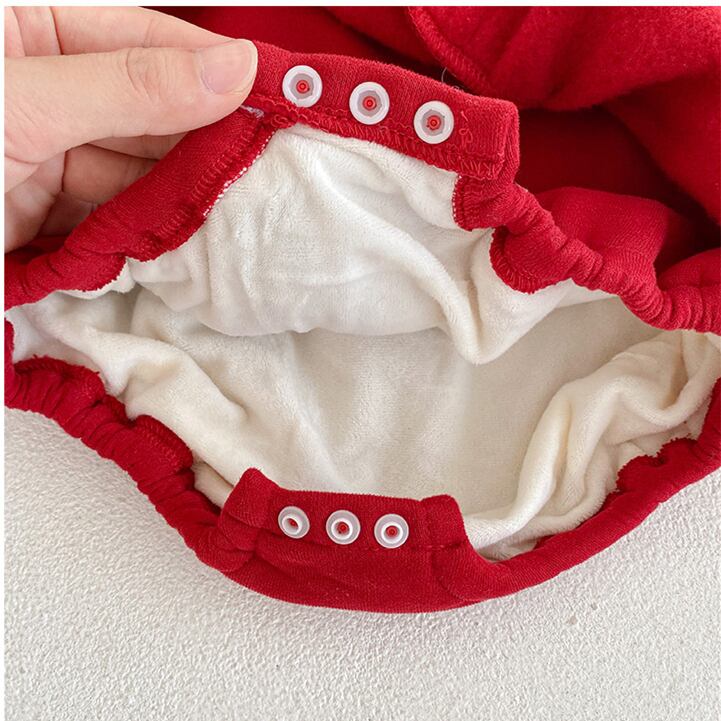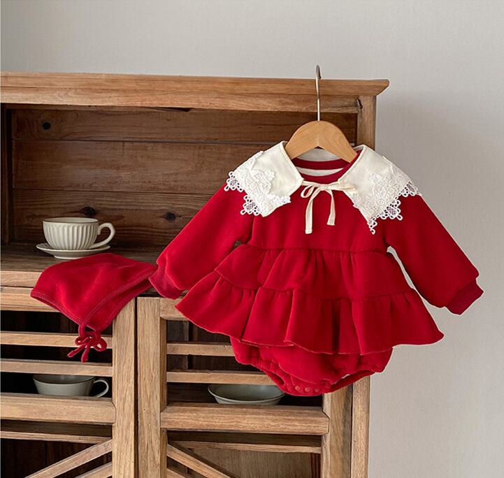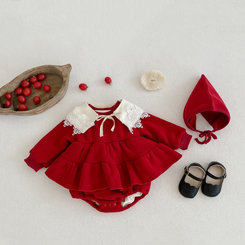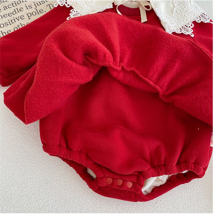 このロンパースは、寒い秋冬にぴったりのアイテムです!かわいらしい帽子が付いており、赤ちゃんを一層魅力的に演出してくれます。裏起毛仕様で、しっかりとした厚手の生地が体をしっかり温めてくれるので、外出時も室内でも安心して着用できます。華やかなレース襟がデザインのアクセントとなり、クリスマスや特別な日のお出かけにも最適です。