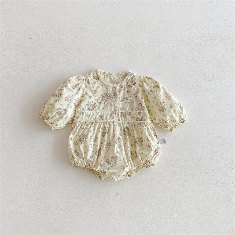 春の訪れを感じさせる可愛らしいデザインのロンパースで、お子様を一層キュートに演出します! ふんわりとしたパフスリーブが魅力的で、動きやすさも兼ね備えています。クルーネック仕様で、着脱も簡単。